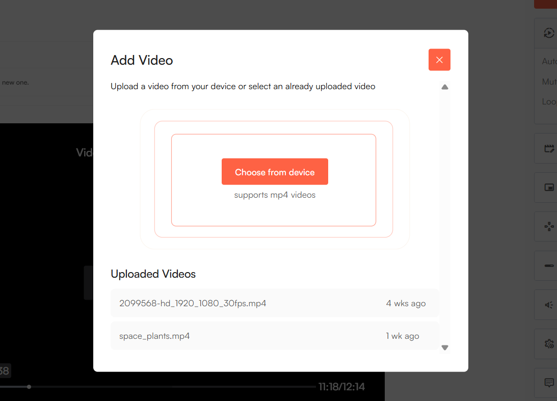 - A pop-up window appears where you can upload a new video from your device or choose from an already uploaded video